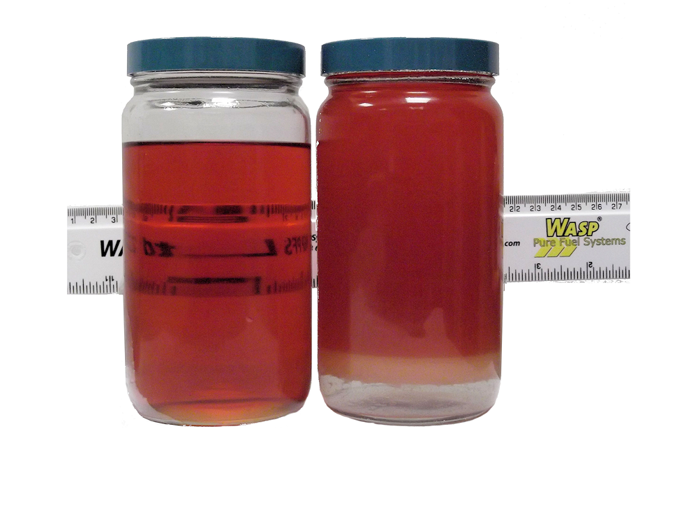 The sample on the right was removed from the bottom of a fuel tank. The cloudy appearance shows the contamination and there is free water at the bottom of the jar. The left example is after one pass through a WASP Fuel Polishing Machine.